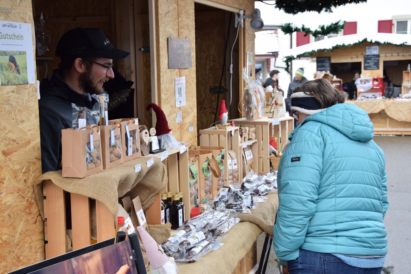 Dahinter öffnet er sich, der Seedorfer Wiehnachtsmärit 2024. Die Tannen stehen im Schneekleid und beobachten die zahlreichen Besucher:innen und es duftet nach Winter und Weihnachtspunch.